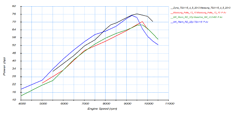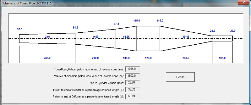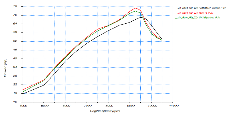 Bei den TSA115 war das anders. Hier habe ich die Simulations-Software EngMod2T genutzt um sowohl die Steuerzeiten als auch den Auspuff auf meine Kriterien zu optimieren (= gute Leistung bei niedriger Drehzahl unter Inkaufnahme von Verlusten oben rum).