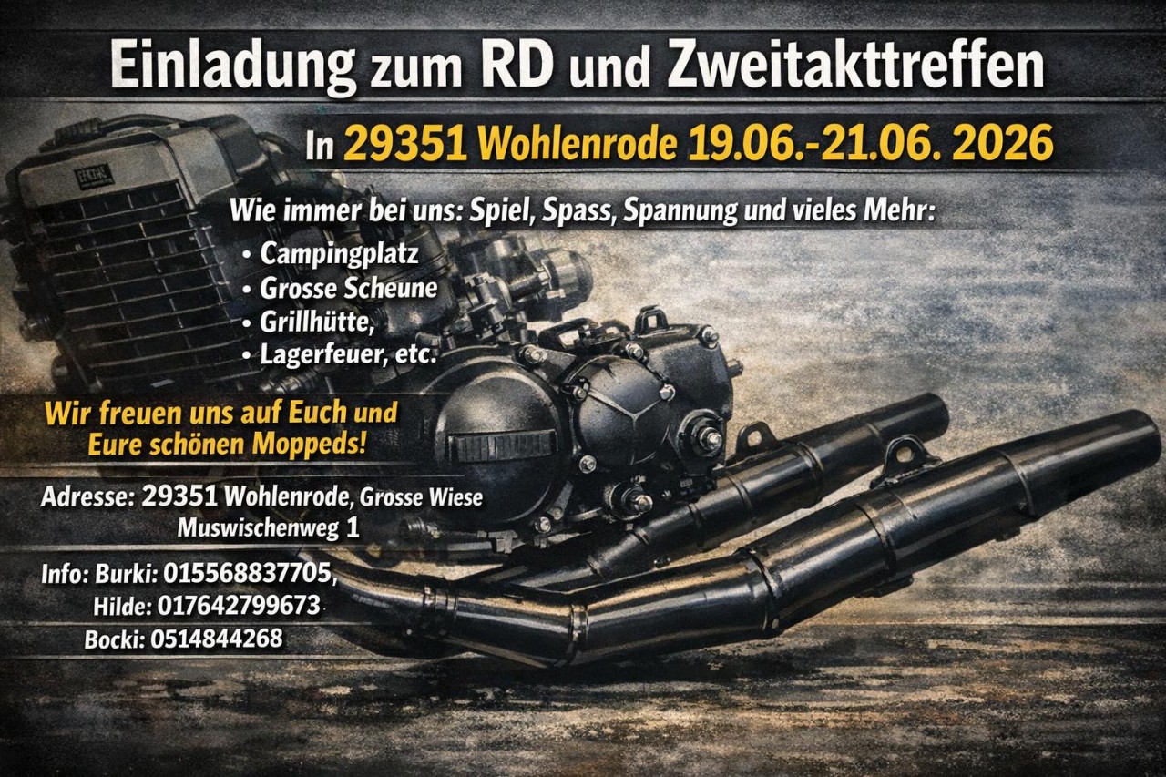 Hallo, es ist wieder soweit das RD und Zweitakttreffen in Wohlenrode findet am 19.bis 21.06.2026 statt.