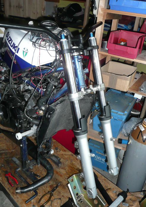 Die obere Brücke ist auch per Schweißen verstärkt, so dass man Lenkerböcke zum anschrauben auf die Serien-Brücke setzen kann (SB-Brücke kostet 160 Eur ...)