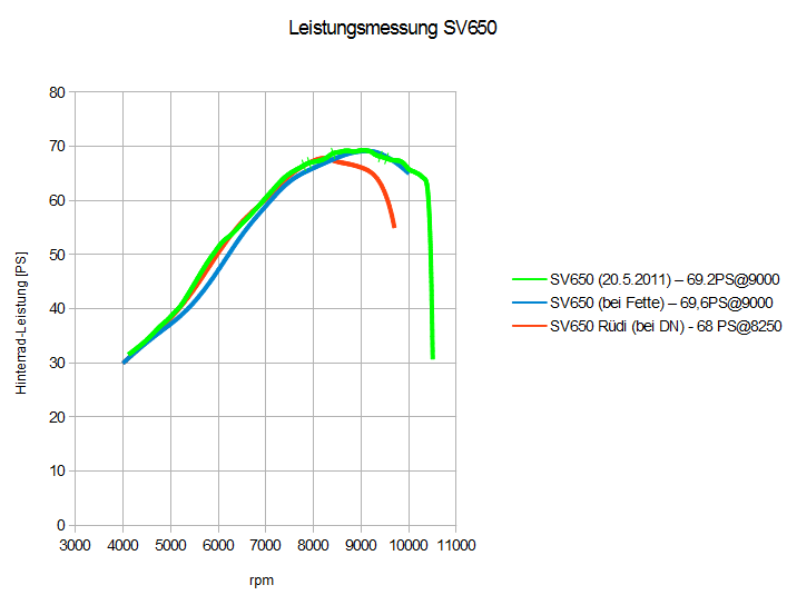 Verglichen mit den anderen beiden SV Messungen liegen die ziemlich gut übereinander was bedeutet, dass man die Messungen der 3 unterschiedlichen Prüfstände (DN, BKW, Fette) durchaus übereinander legen darf. Sie zeigen alle im Bereich 2-3 PS gleich an.